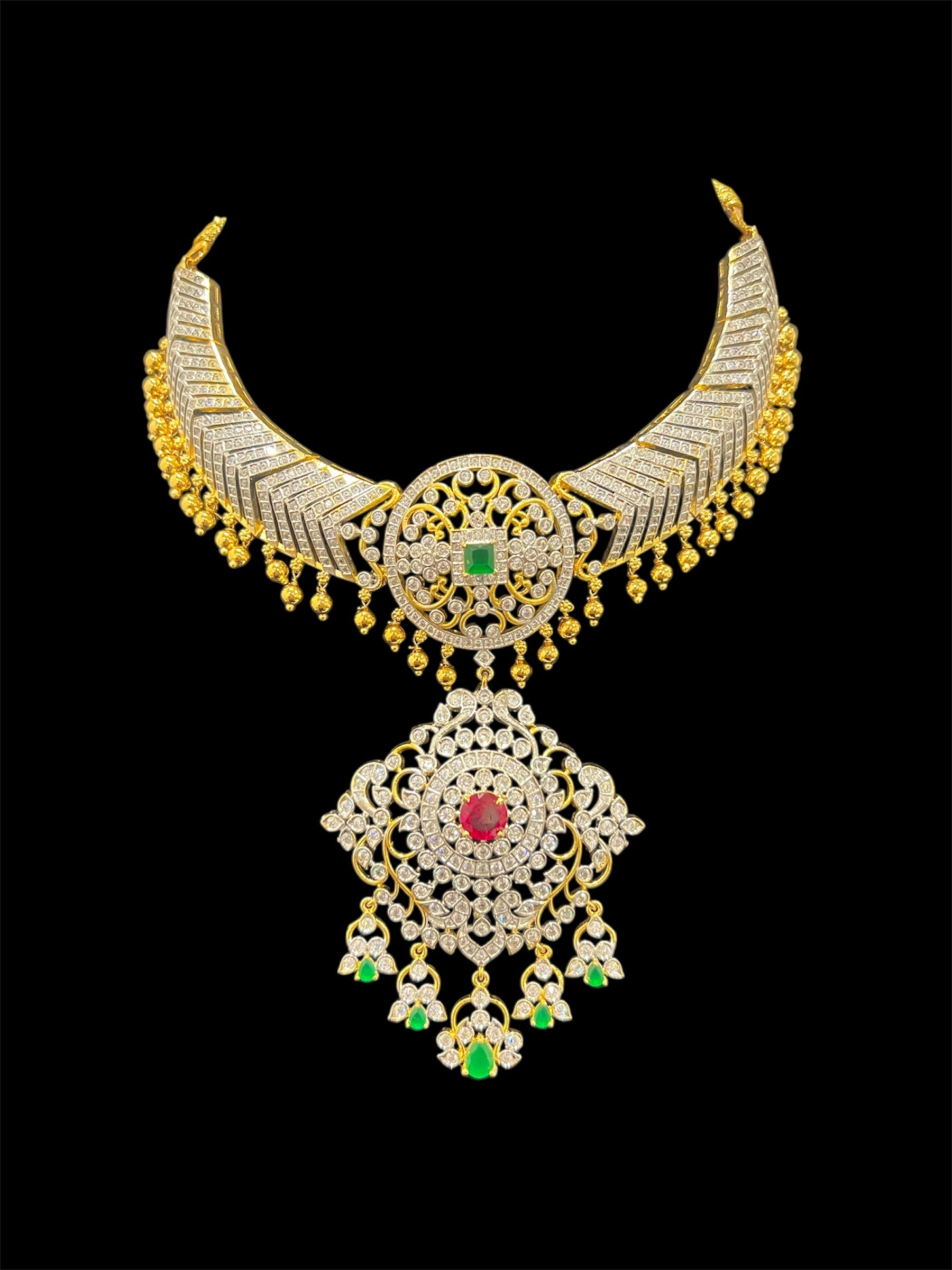This diamond look Tussi Necklace set is a stunning addition to any jewelry collection. With a necklace that sits just below the neck and matching earrings, this set is perfect for adding a touch of elegance to any outfit. The diamond-like stones provide a luxurious look without the high cost.
