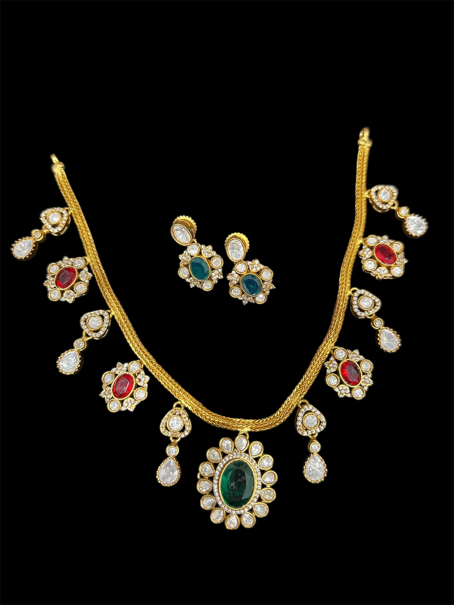 Experience timeless elegance with our Polki Drops minimal chain set. Made with stunning Moissanite stones, this set comes in two beautiful colors and is paired with matching studs for a complete look. Elevate any outfit with the sparkle and sophistication of our minimal chain set.